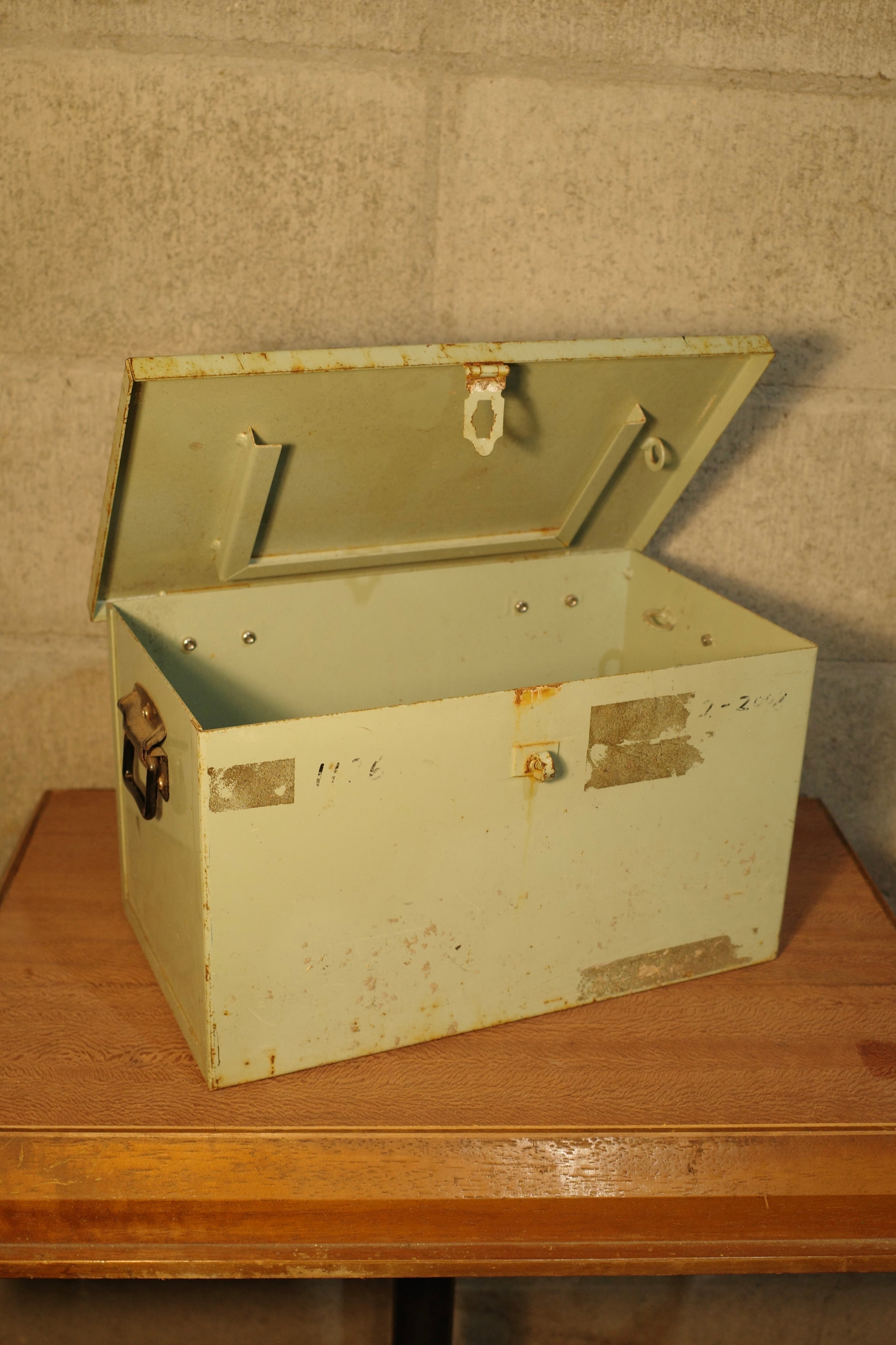 古い鉄製ボックスになりますので、スレや剥げ、当たりキズ、削げ、割れ、欠け、落としきれない汚れなどがあります。全体的に状態も良いのでまだまだ実用的に活躍してくれます。